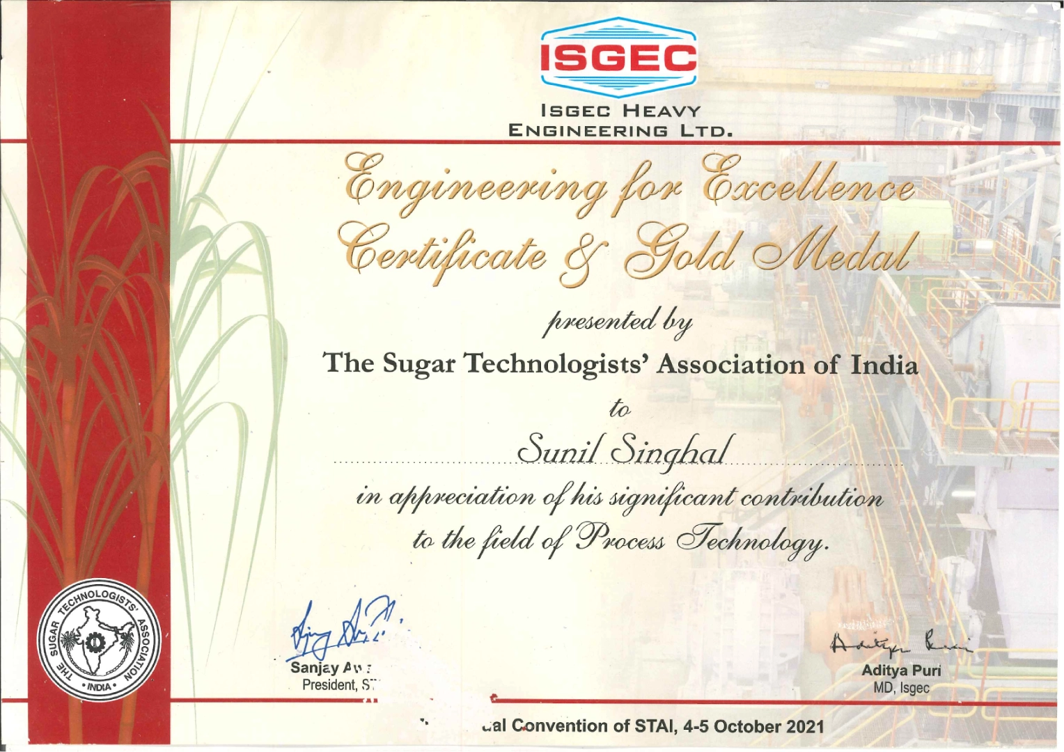 • Patent 241118 – “A PROCESS FOR PRODUCING SUGAR AND ALCOHOL FROM SUGARCANE” on 29-03-2004.